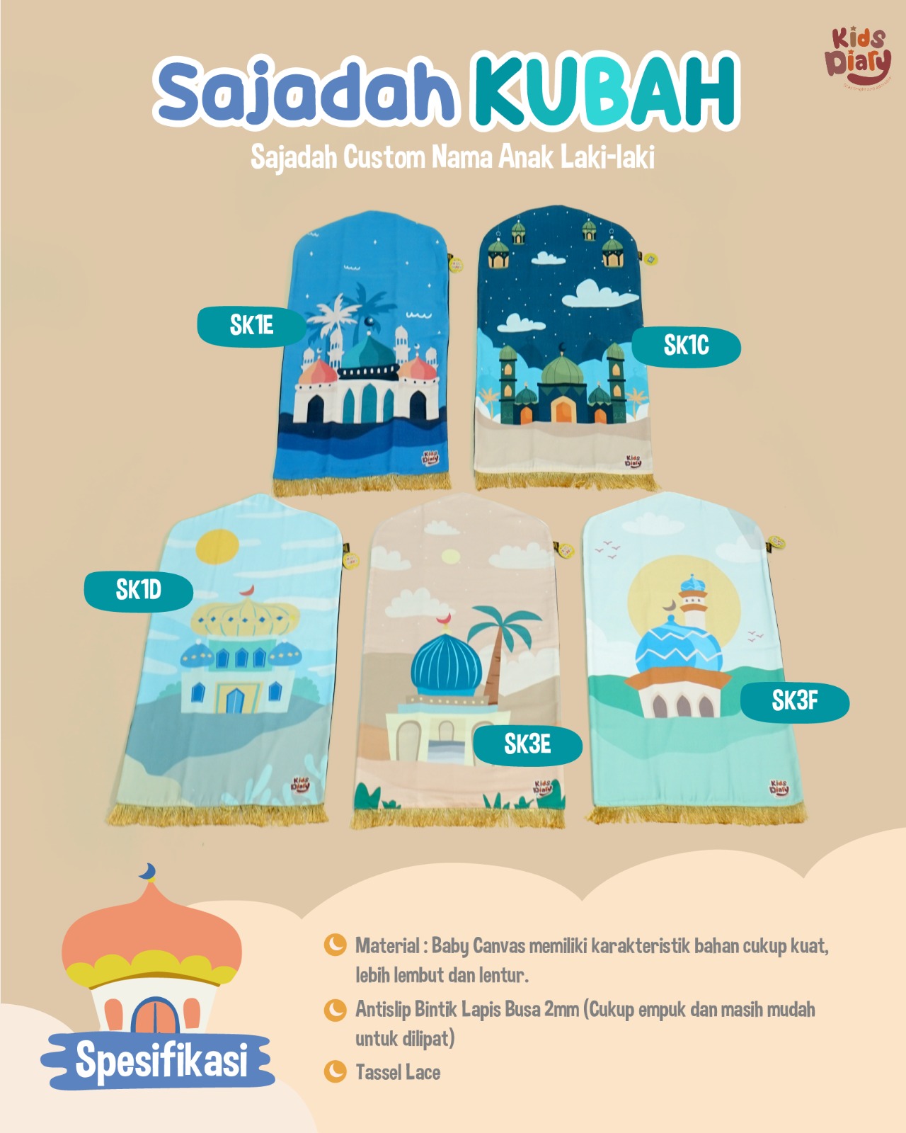 Sajadah ini bisa custom nama anak kamu ya, jadi makin terlihat cakep deh😍