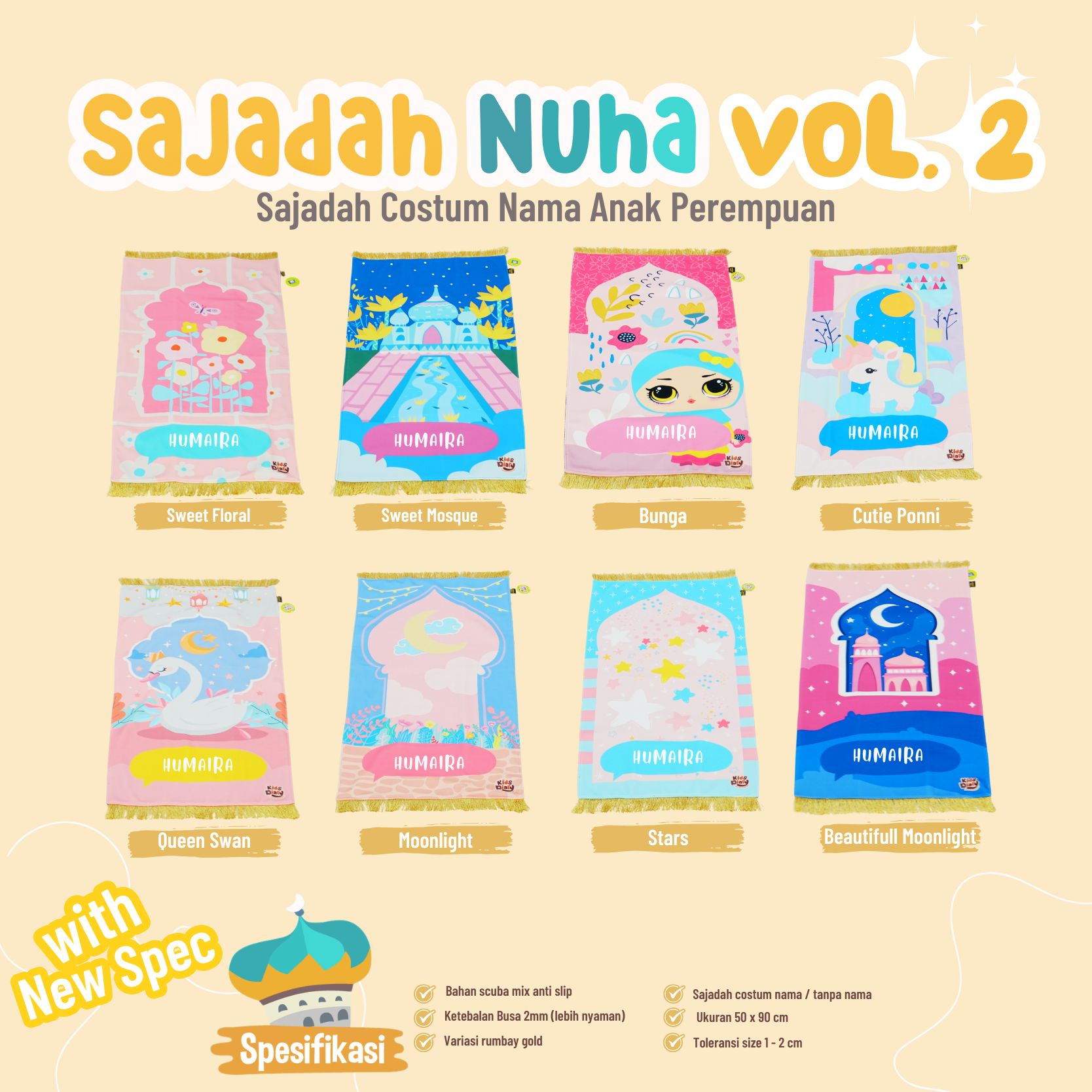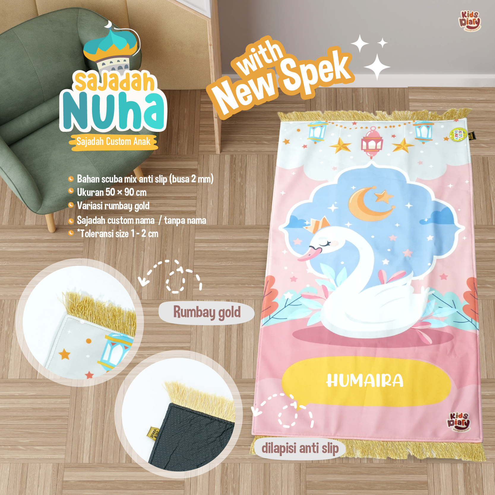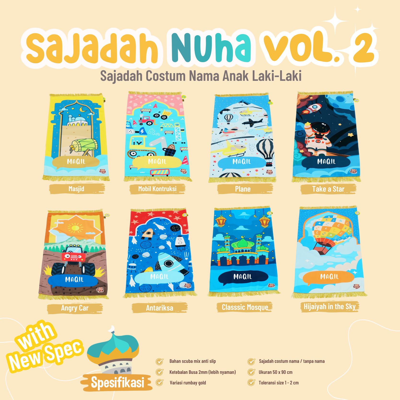 Spesifikasi Sajadah Anak : – Bahan : Silky Scuba Mix Antislip Busa 2mm (Lebih nyaman dipakai) – Ukuran 50cm x 90cm – Desain Eksklusif – Maks 8-9 karakter